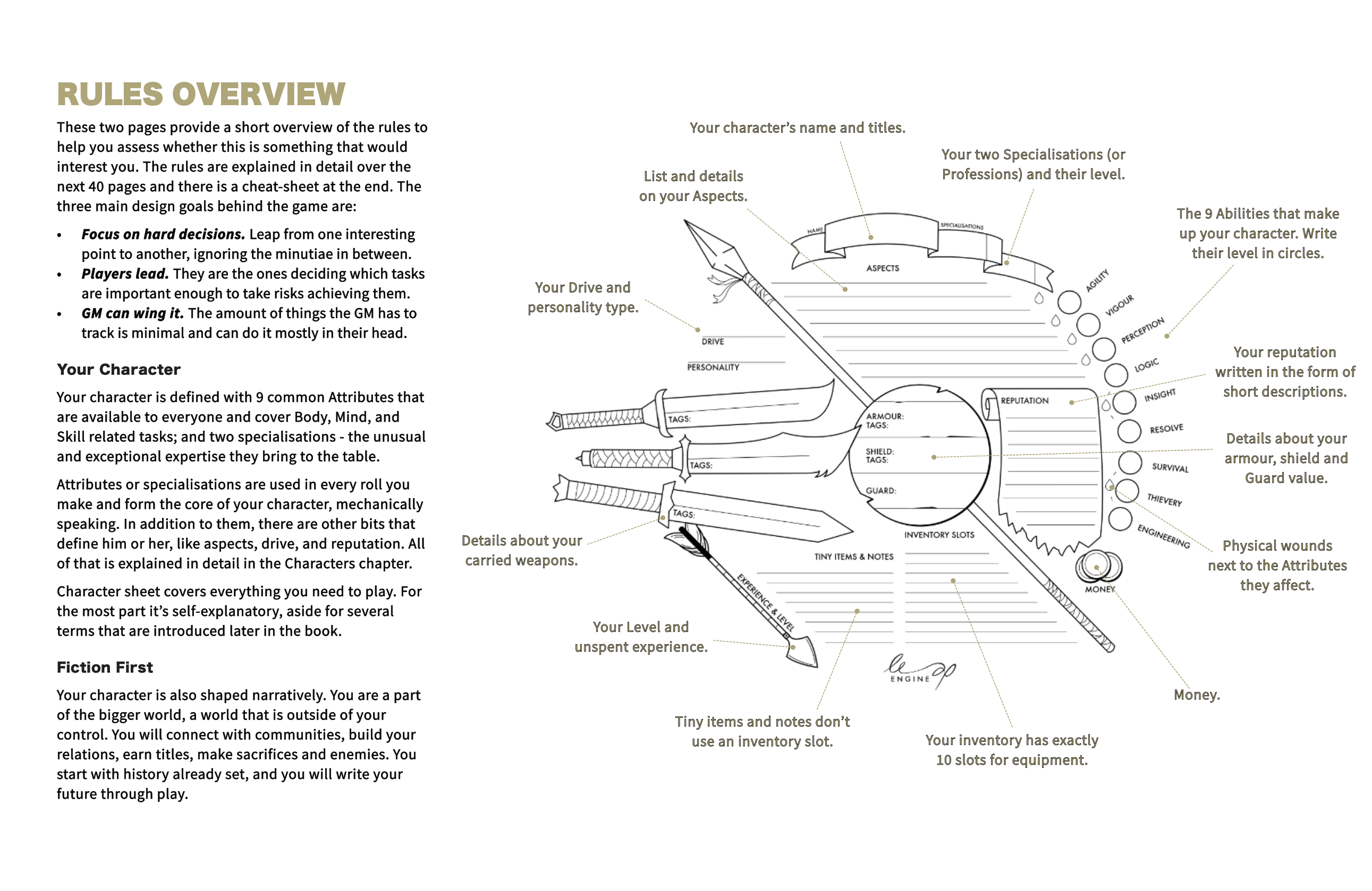 The main design goal is to make it accessible to those whose time is limited but still expect quite a bit of depth from their games. It aims to make it easy for the GM to moderate the game with little to no preparation, but it is still flexible enough to allow for complex characters, actions, and situations. Story, theme, and flavor are yours to create, while the engine provides you with the means to do so.
