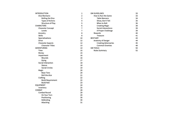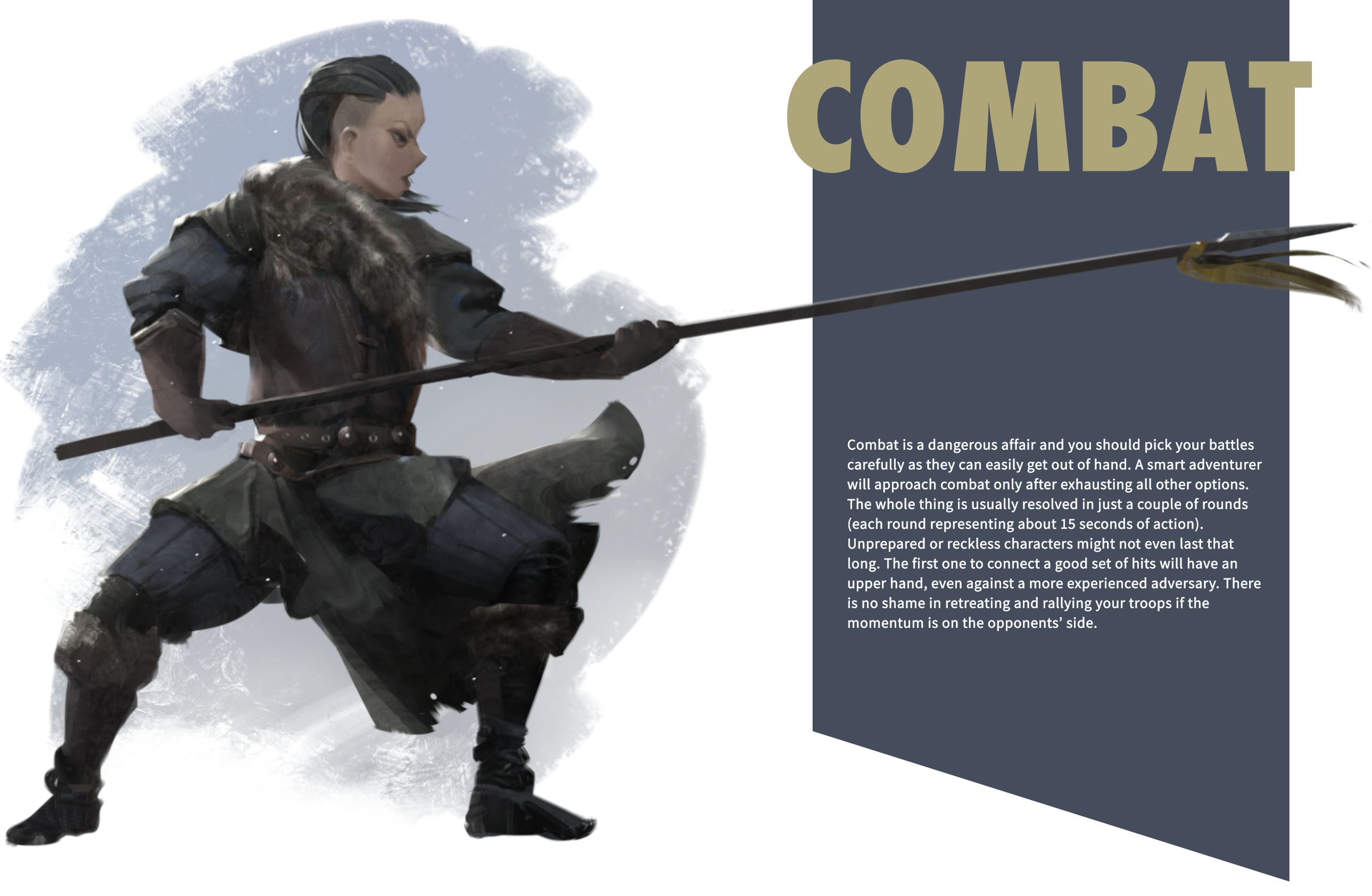This document covers everything you need to play, and then some. It is loosely built around a fantasy setting, but it can be used for different genres as well. The game works best when played with semi-realistic characters. Characters that are heroes, but still vulnerable and invested in the world they occupy.