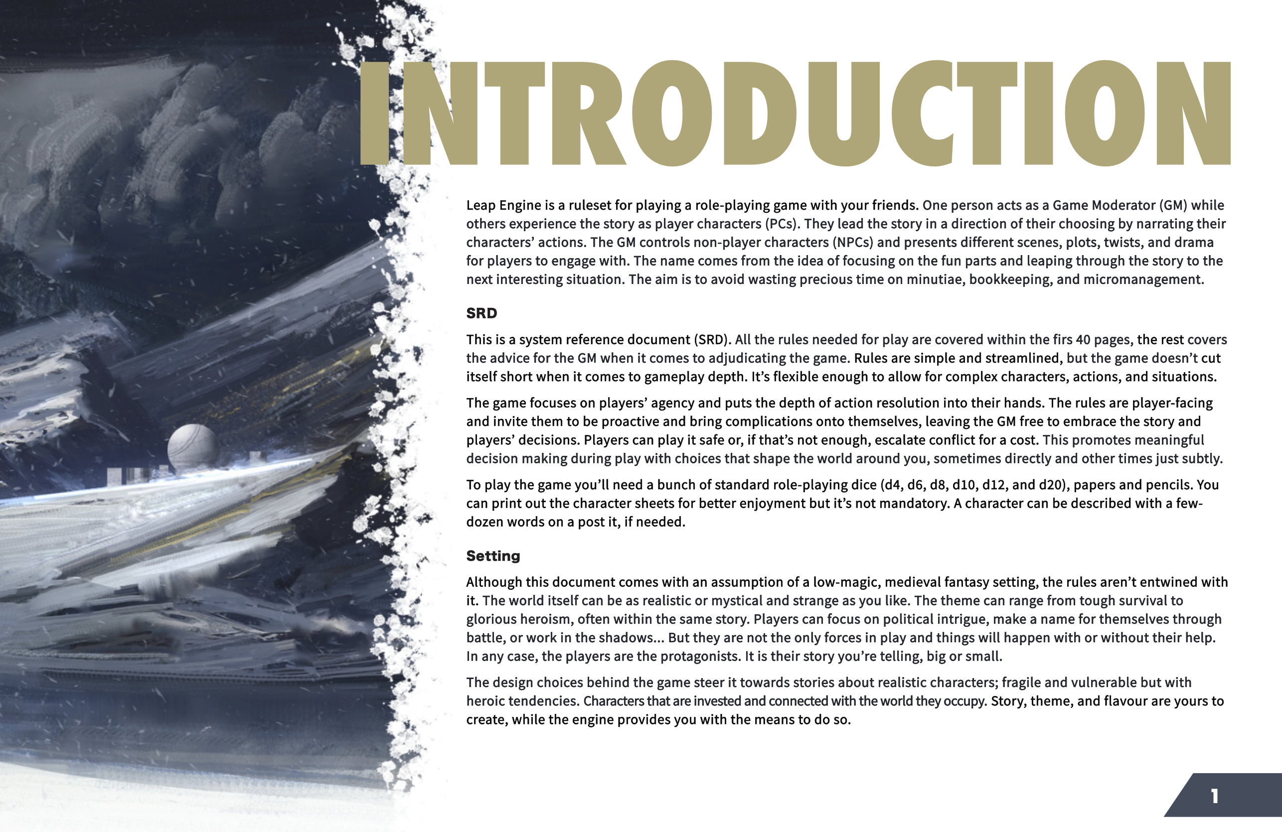 Leap Engine is a set of core rules (SRD) for playing a role-playing game with your friends. The rules are light and concise, built around a simple player-facing attribute die + difficulty die roll mechanic. The game promotes the idea that players are the ones controlling risk and how far to push each situation. They will, inevitably, create complications for themselves and give the GM an opportunity to build on that.