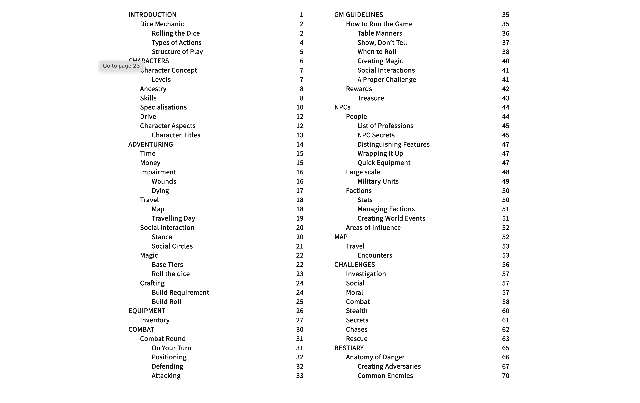 The whole document has about 70 pages long. The first half are player-facing rules and the second are tips and tools for the GM.